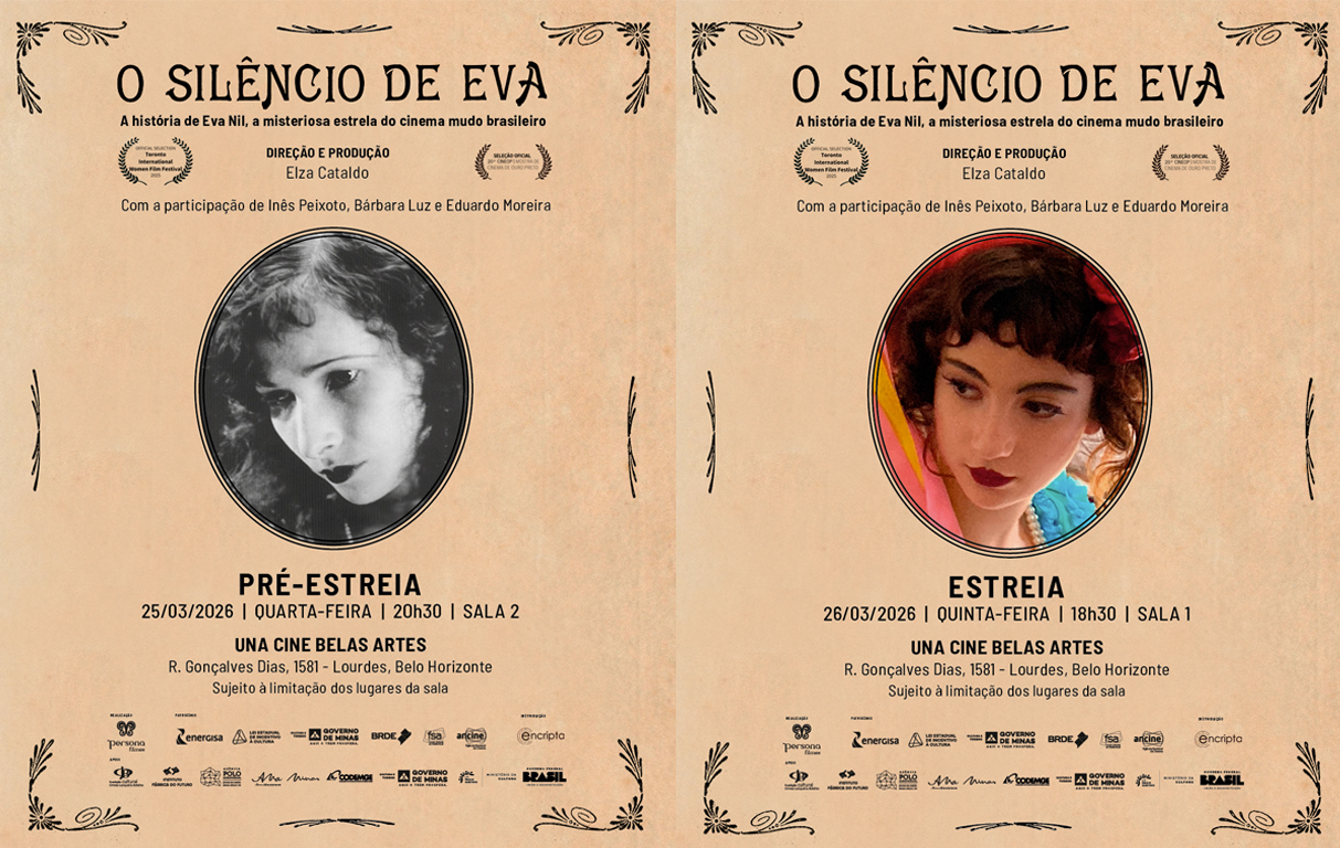 O resultado é uma costura entre a memória gráfica da década de 1920 e a linguagem contemporânea. O filme, estrelado por Inês Peixoto e Bárbara Luz, investiga o apagamento histórico de Eva Nil em uma narrativa poética que mistura arquivo e encenação. É uma honra para a Voltz assinar a identidade visual de um projeto que resgata a força do ciclo de Cataguases e a trajetória de uma pioneira do nosso cinema.Eva Nil, nome artístico de Eva Comello, nasceu no Cairo, em 1908, filha de italianos. Ainda criança, veio para o Brasil e se estabeleceu em Cataguases, cidade que teve papel importante nas primeiras décadas do cinema brasileiro. Ela integrou o chamado ciclo de Cataguases e atuou em filmes como “Valadião, o Cratera” (1925) e “Na Primavera da Vida” (1926), dirigidos por Humberto Mauro.