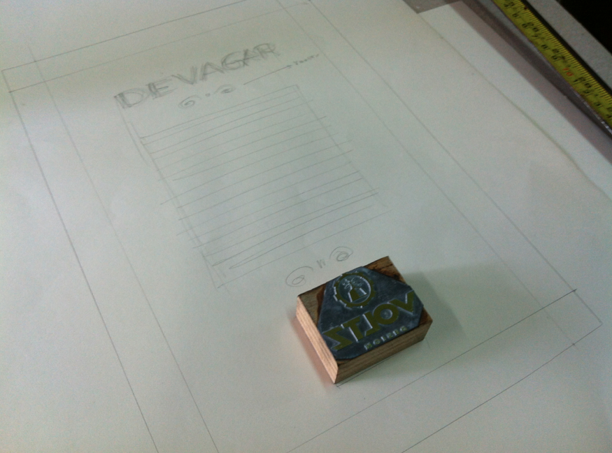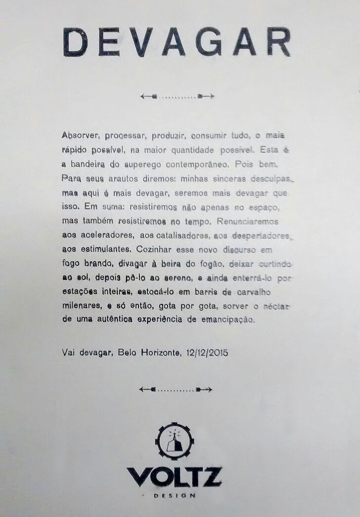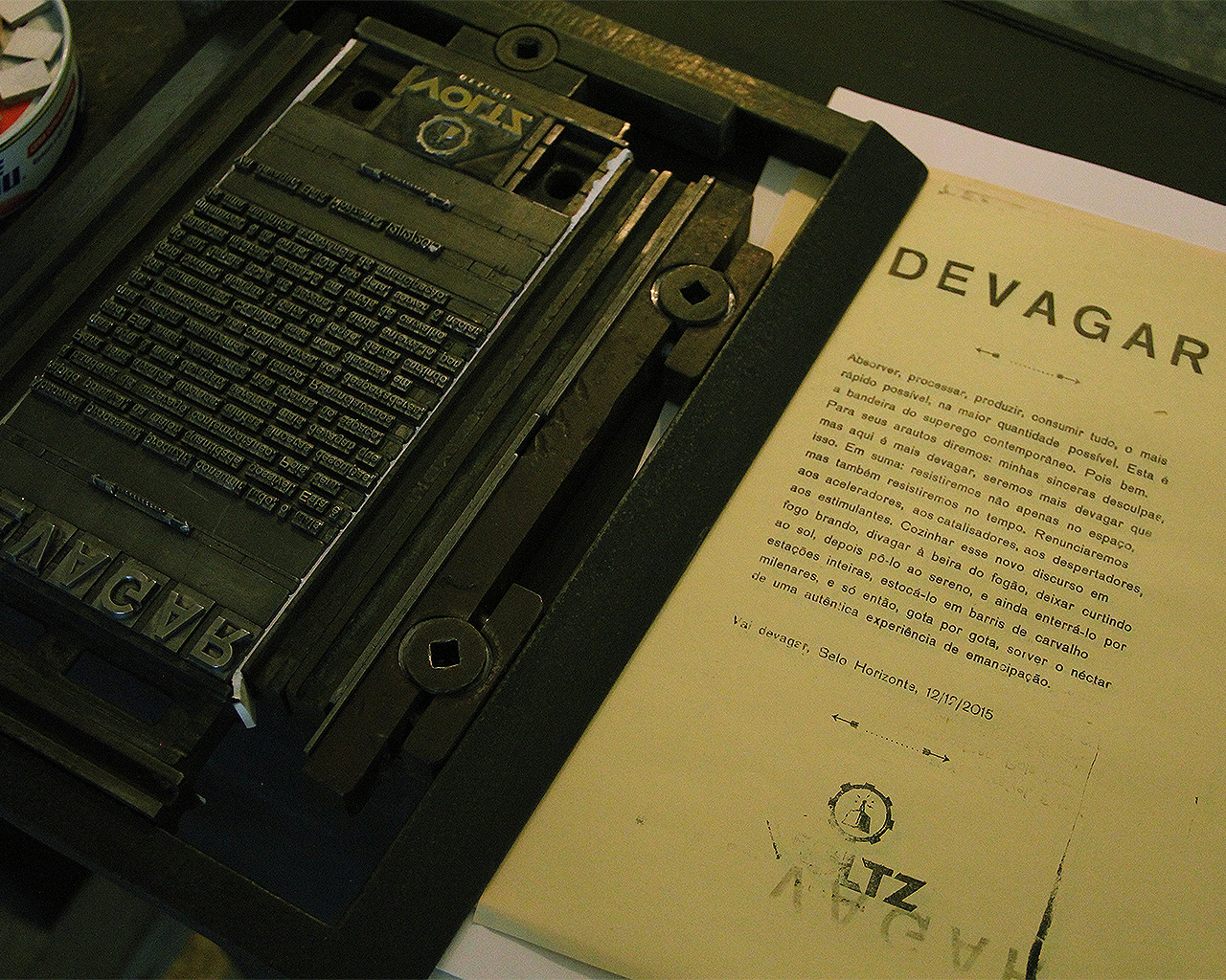 Prova de prelo de parte do texto manifesto do DEVAGAR, impresso em tipos móveis na tipografia Matias em BH. Abaixo, primeira logo da Voltz, a partir de clichê. Durante o evento, enquanto as pessoas usam a prensa para acessar vídeos e fotos, elas vão gerando uma impressão com tinta em papel, que podem levar para casa como lembrança do evento.