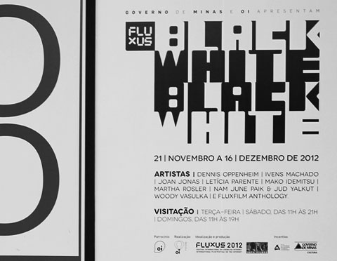 Para esta edição do Fluxus 2012, desenvolvemos uma composição tipográfica visual para a palavra BLACK / WHITE. A ideia era criar um diálogo com a curadoria. “A exposição sugere uma dicotomia entre as imagens preto e branco e posturas de de gênero feminino e masculino. De um lado estão as artistas mulheres, com sua força contestadora, expondo sua expressividade; e de outro, os homens que reafirmam seus domínios no amplo e ecléticos espaços da arte”.