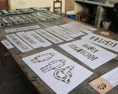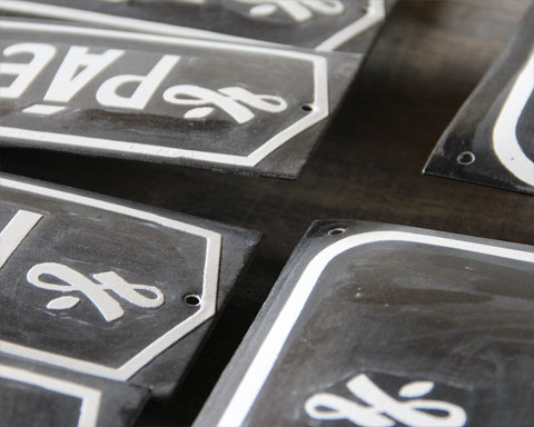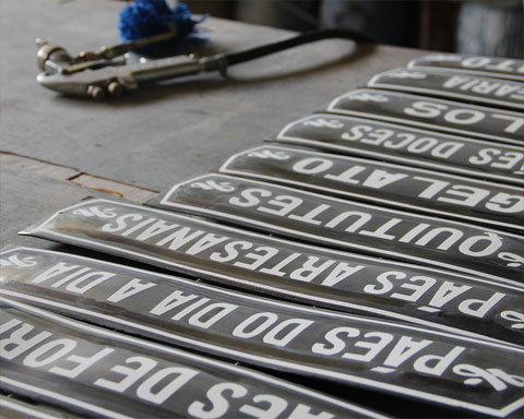 As placas esmaltadas fazem parte do nosso cotidiano, seja pelos números das casas ou pelas placas de rua afixadas nas paredes. Além disso, a técnica de esmaltar é muito utilizada em utensílios de cozinha. Optamos por usar a cor preta por causa da paleta de cor da loja e para diferenciar do azul clássico das placas de rua.