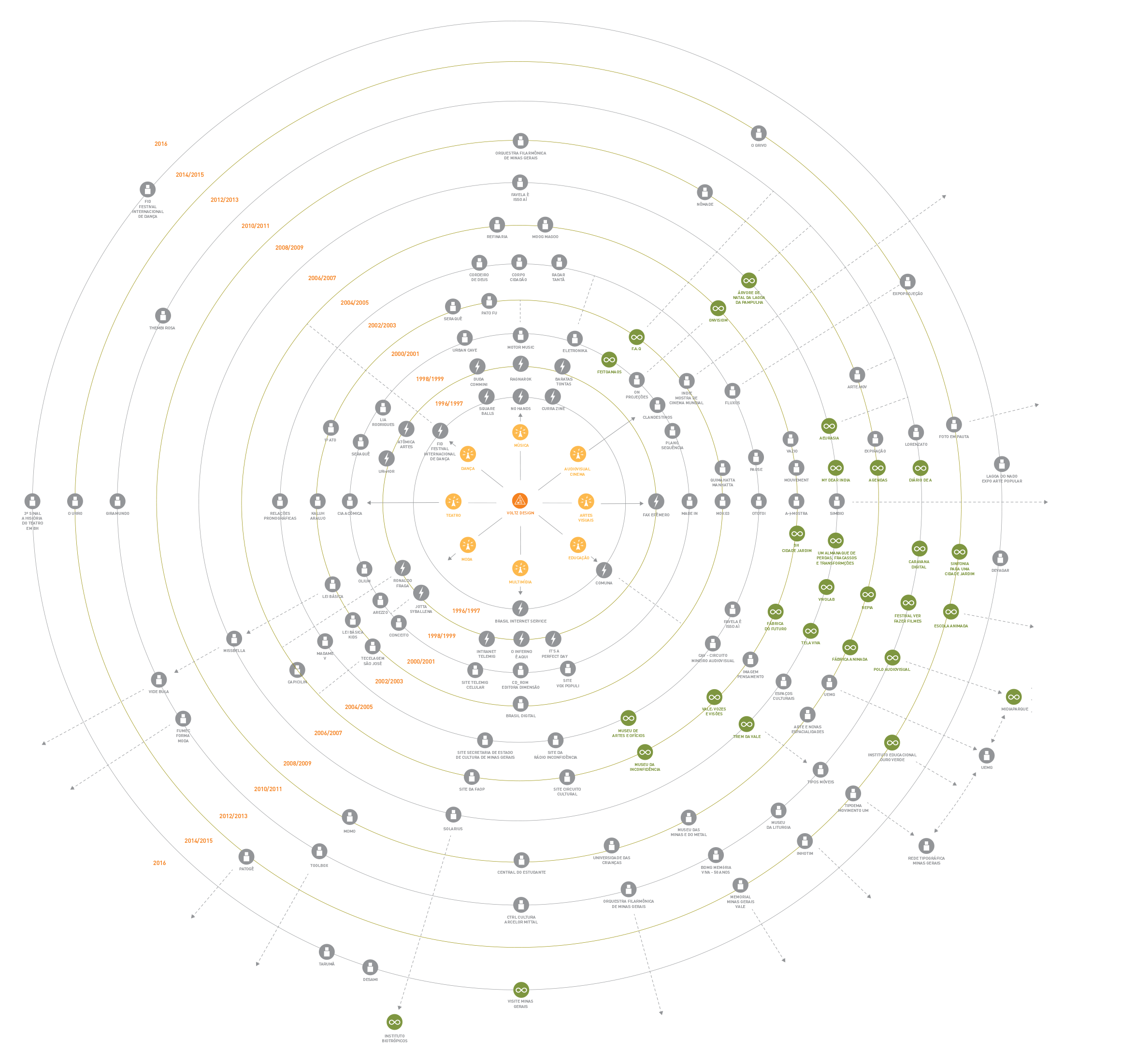 A partir de agora vamos fazer publicações relativas a essas conexões entre a Voltz e a cultura de Belo Horizonte e de Minas Gerais. A ideia é ir revelando as pessoas que estavam e que estão envolvidas em vários destes projetos, fatos e curiosidades, a partir de ciclos temporais, suas conexões e expansões. Através de um infográfico pretendemos ampliar as potências dessas conexões através dos relatos das pessoas envolvidas: designers, músicos, bailarinos, atores, cenógrafos, estilistas, escritores, artesãos, programadores, produtores, diretores, cineastas, videoartistas, técnicos, jornalistas, empreendedores, gestores etc. Assim, teremos o resgate da memória coletiva.