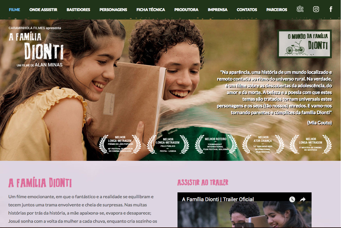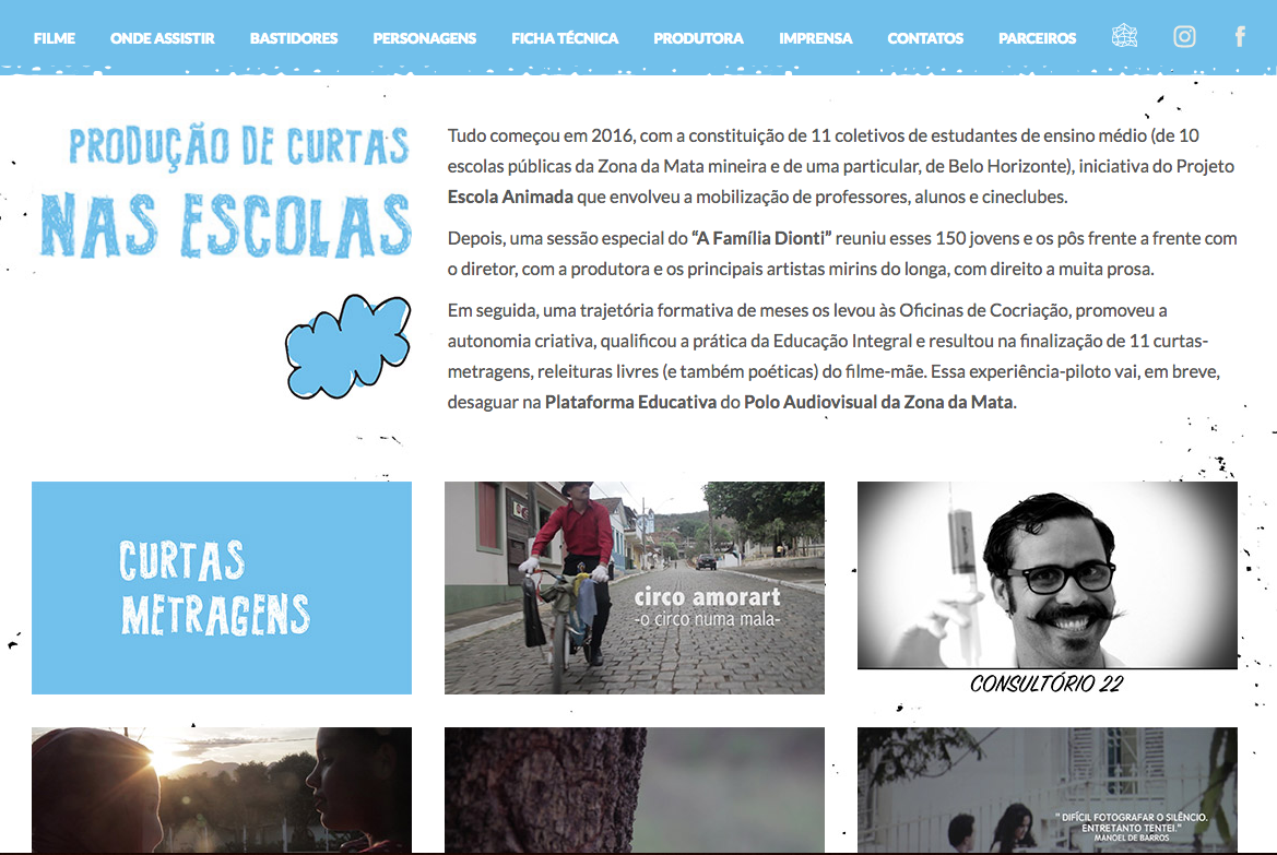 O filme “A Família Dionti”, direção do cineasta e Alan Minas e produção da Caraminhola Filmes, foi escolhido para que fizéssemos a ativação de sua comunicação por seu forte apelo para a área de educação e pela delicadeza no trato de temas como a adolescência, o amor e a morte. A estratégia transmídia aplicada visava ampliar a presença e o alcance do filme, inserindo-o também no mercado da Educação – como experiência-piloto do projeto Plataforma Educativa, do Polo Audiovisual da Zona da Mata – e no Licenciamento de Produtos.